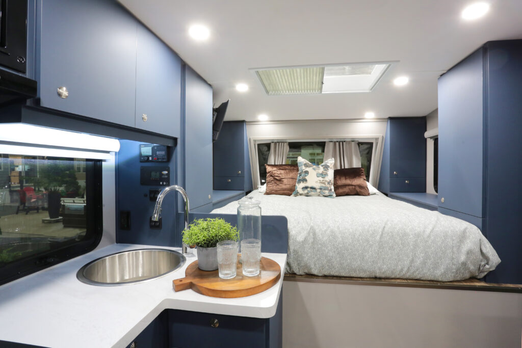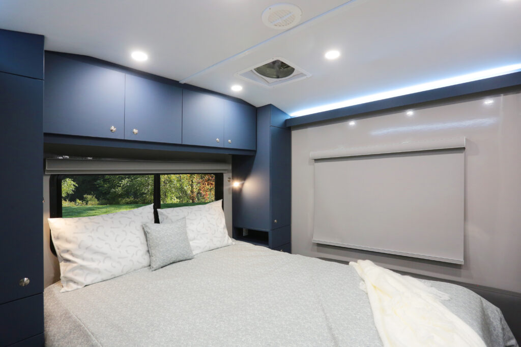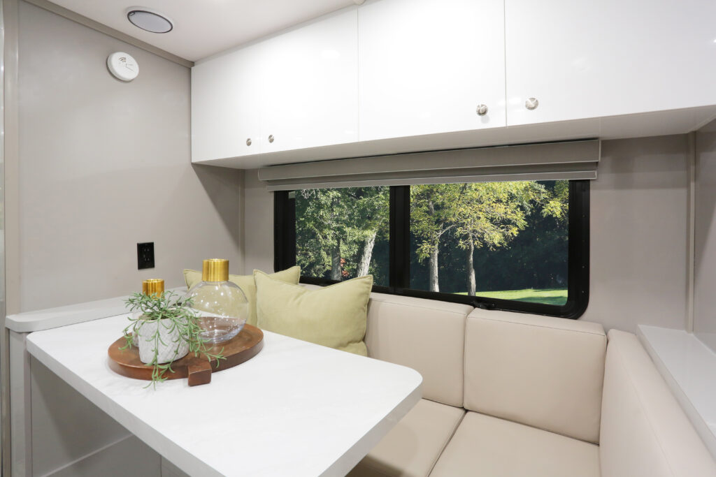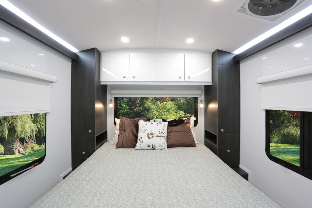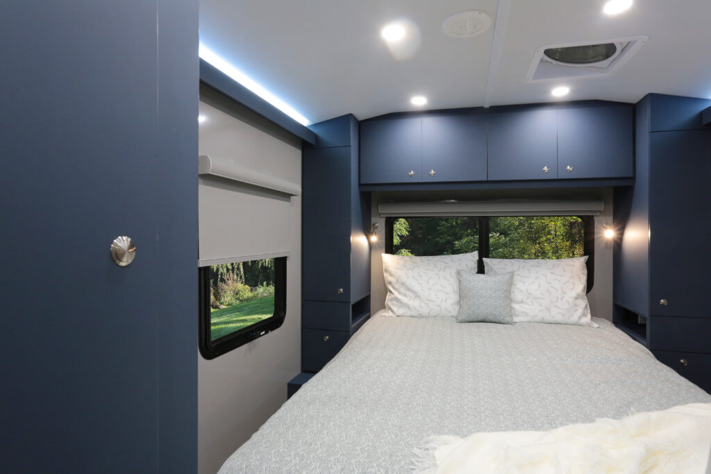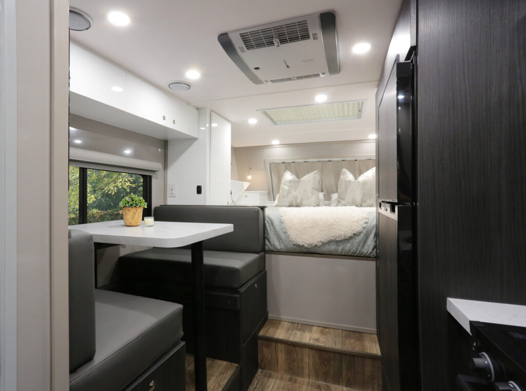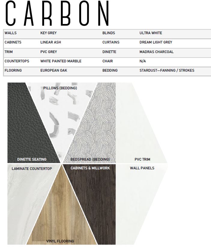 The Carbon interior package blends cool grey tones with natural textures to create a space that feels both contemporary and comfortable. Soft grey walls, crisp white accents, and subtle patterns give the interior a clean, modern look, while warm wood finishes and rich charcoal seating add depth and character. Thoughtfully designed bedding and surfaces bring texture and style, creating a balanced and refined atmosphere that feels like home—wherever the road takes you.