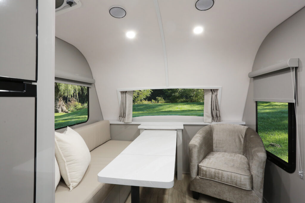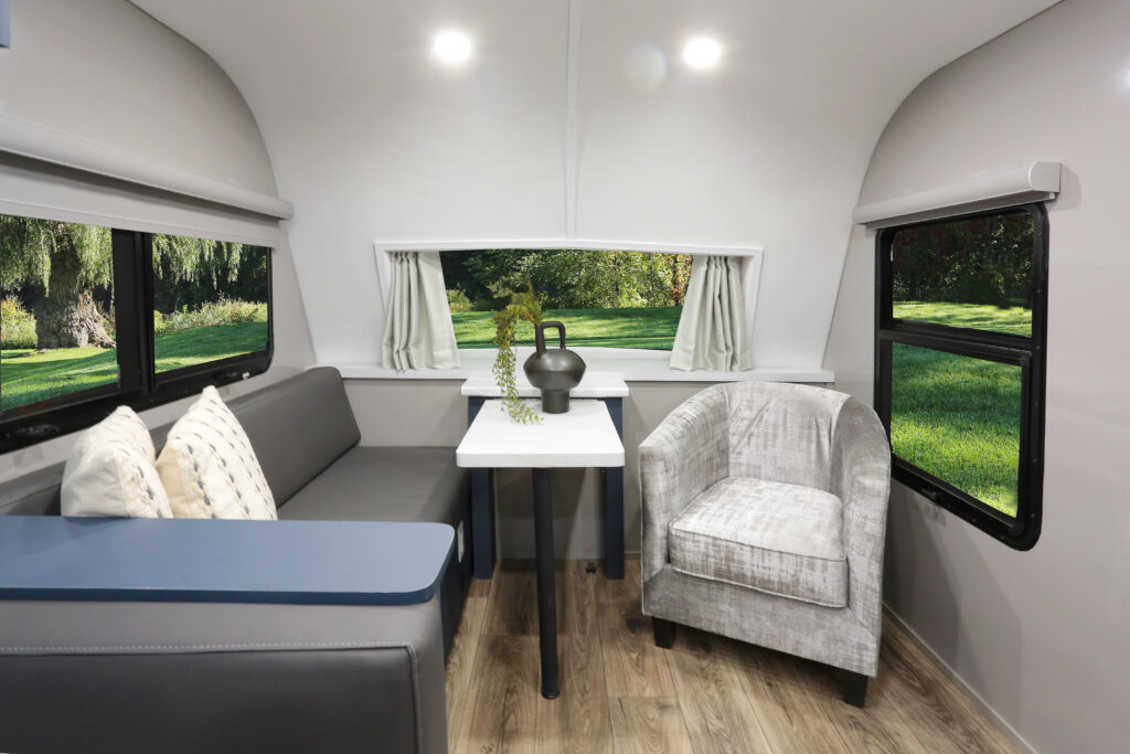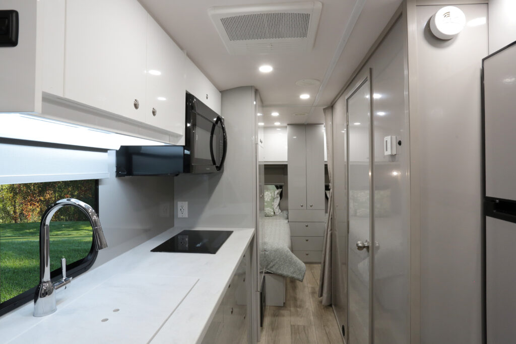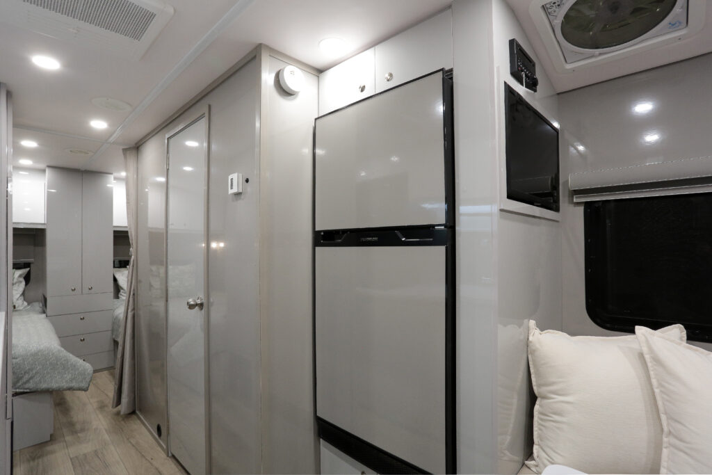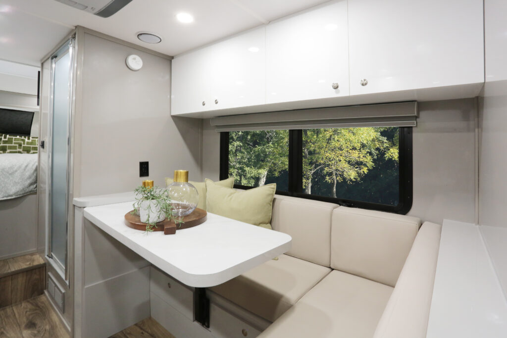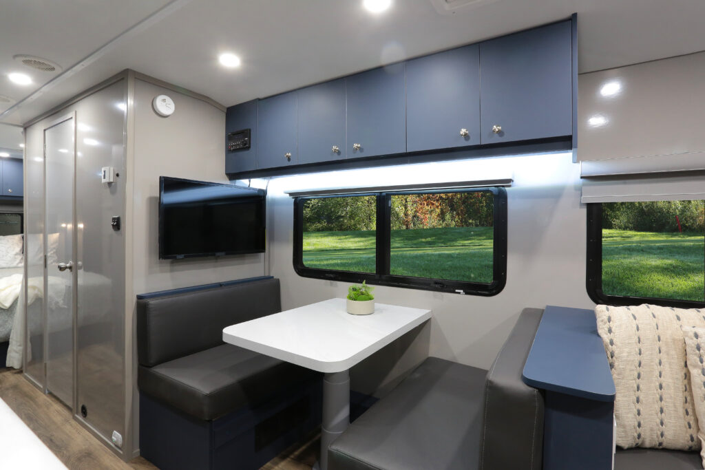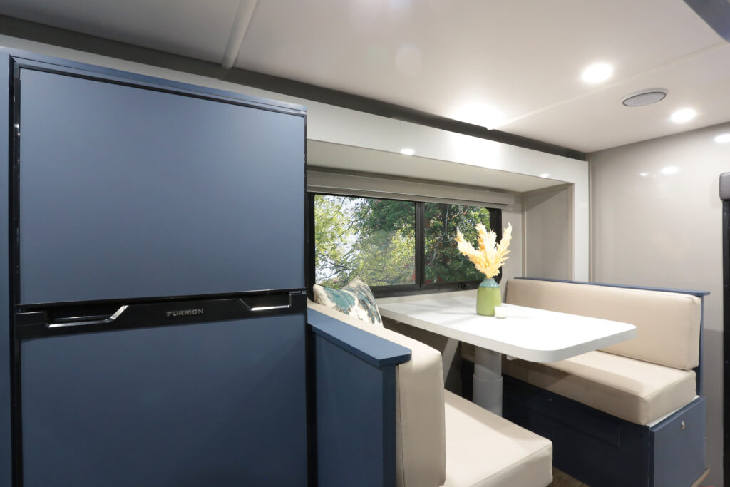 The Carbon interior package blends cool grey tones with natural textures to create a space that feels both contemporary and comfortable. Soft grey walls, crisp white accents, and subtle patterns give the interior a clean, modern look, while warm wood finishes and rich charcoal seating add depth and character. Thoughtfully designed bedding and surfaces bring texture and style, creating a balanced and refined atmosphere that feels like home—wherever the road takes you.