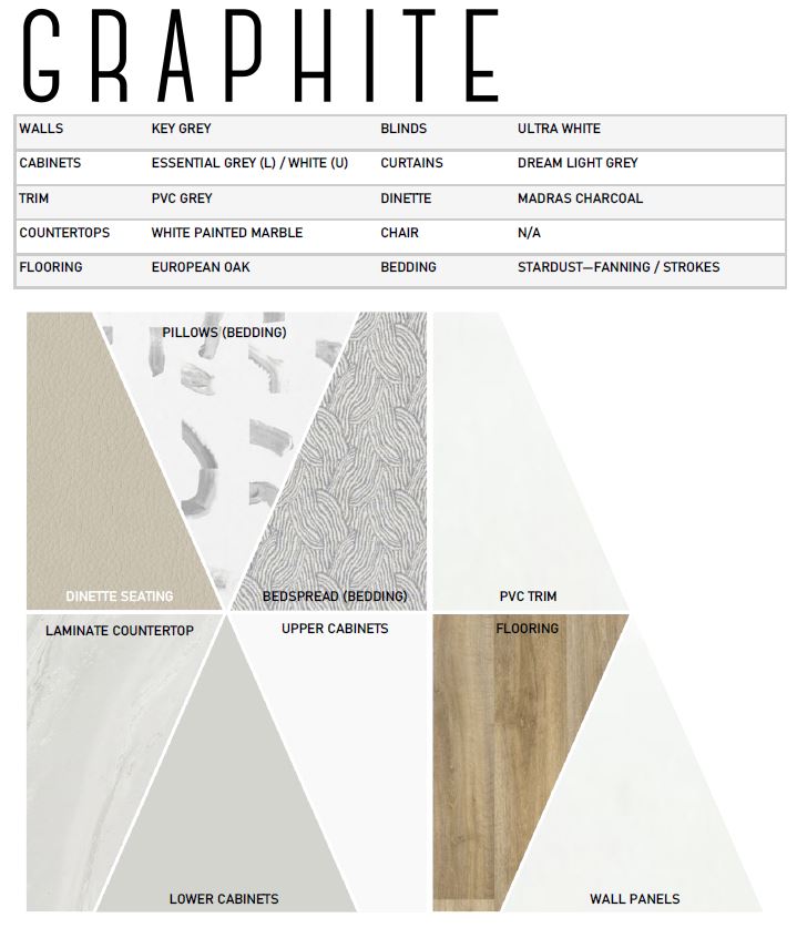 The Graphite interior package offers a fresh, contemporary atmosphere with a light and airy aesthetic. A mix of soft greys and whites creates a clean, calming foundation, while the layered textures of light-toned cabinetry and oak flooring add warmth and visual interest. Thoughtful details like elegant bedding patterns and smooth marble-style countertops bring harmony to the space. Graphite is the perfect blend of simplicity and style—designed to feel effortlessly modern and endlessly relaxing.