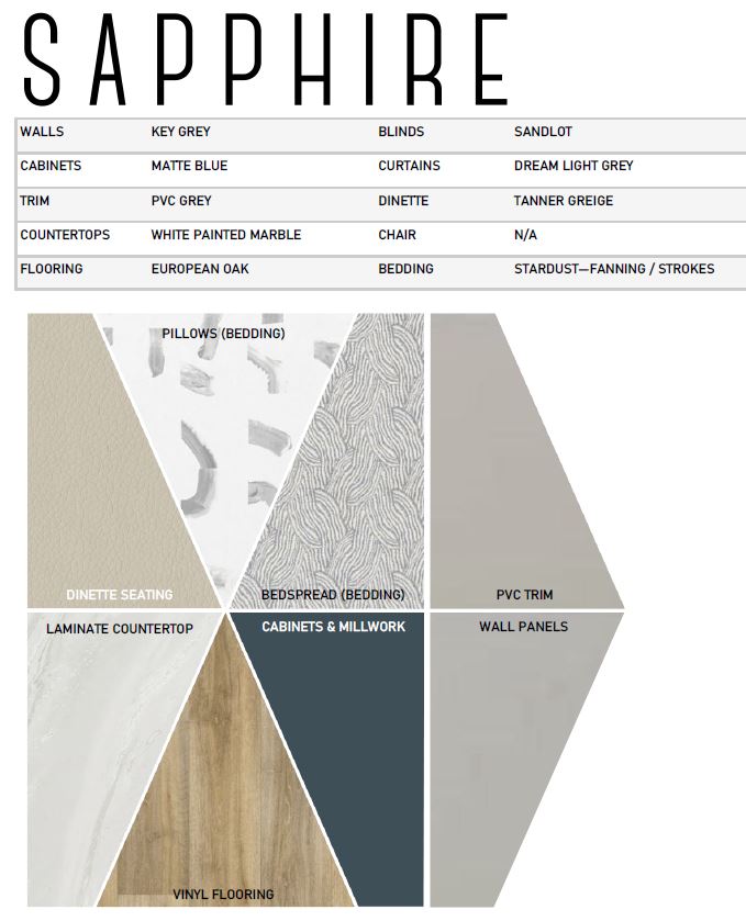 The Sapphire color package creates a fresh, modern atmosphere with a soothing blend of cool tones and soft textures. Designed for those who appreciate clean, contemporary aesthetics, it combines subtle contrasts and natural finishes to bring a sense of calm and sophistication to any space. The mix of light wood tones, soft greys, and deep blue accents offers a balanced, stylish look that feels both welcoming and refined. With thoughtfully layered materials and patterns, Sapphire is perfect for creating a serene, elevated interior.