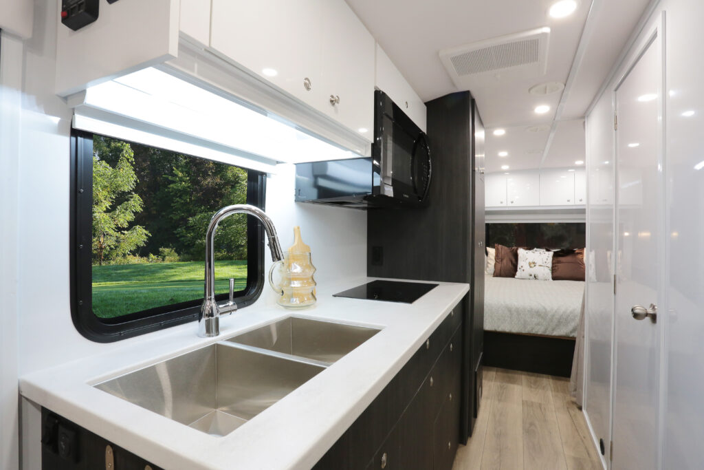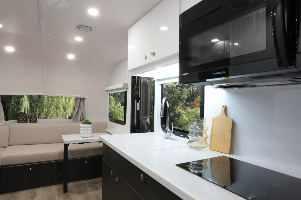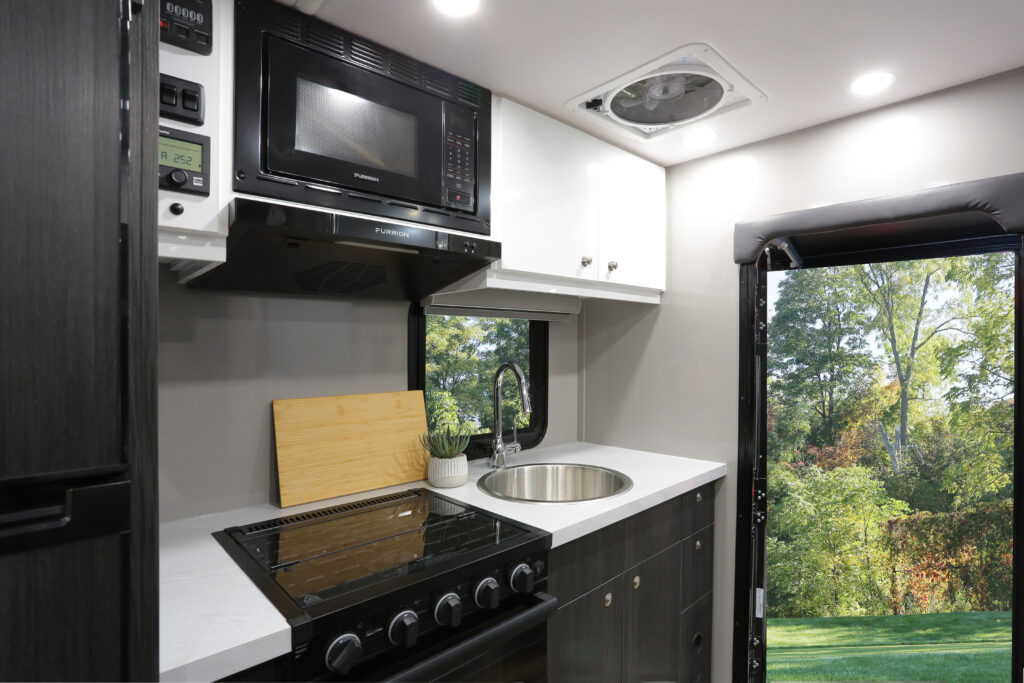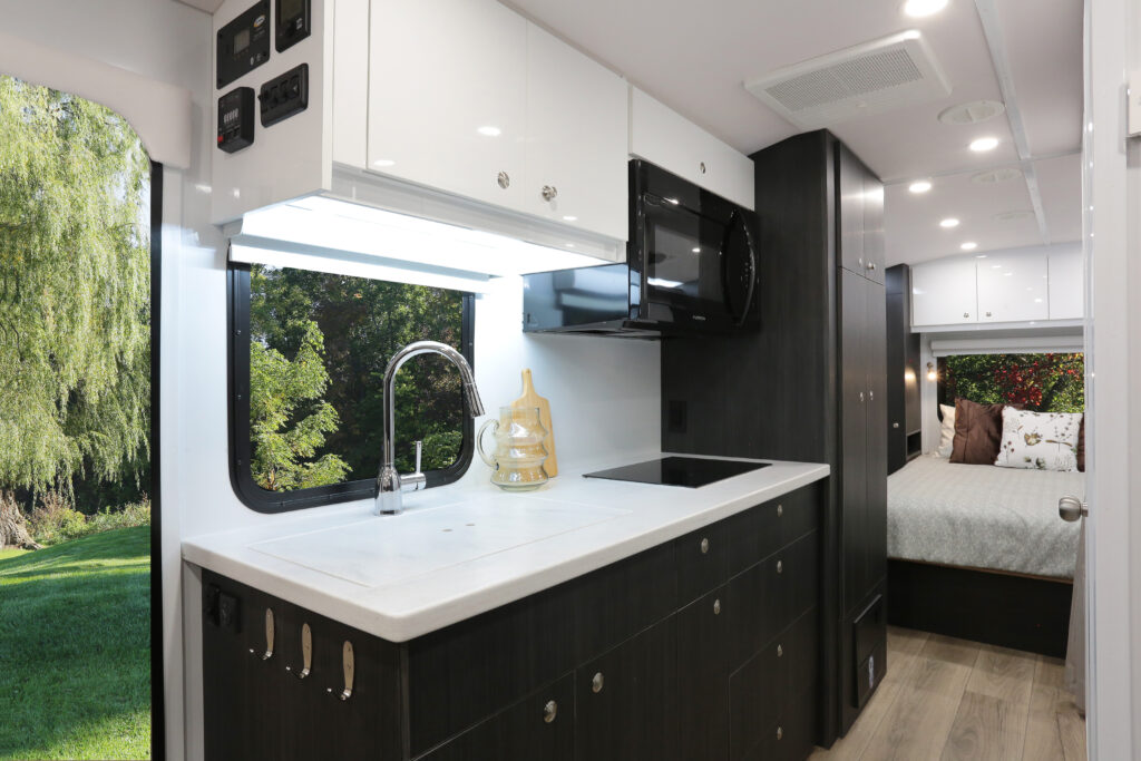 The Onyx interior package blends deep, rich tones with crisp, pristine finishes. Dark cabinetry and plush Charcoal seating create a dramatic foundation, perfectly balanced by bright white upper cabinets and warm European oak flooring. With marble-style countertops and carefully layered textures throughout, Onyx offers a striking yet balanced design—perfect for those who appreciate refined contrast and contemporary style.