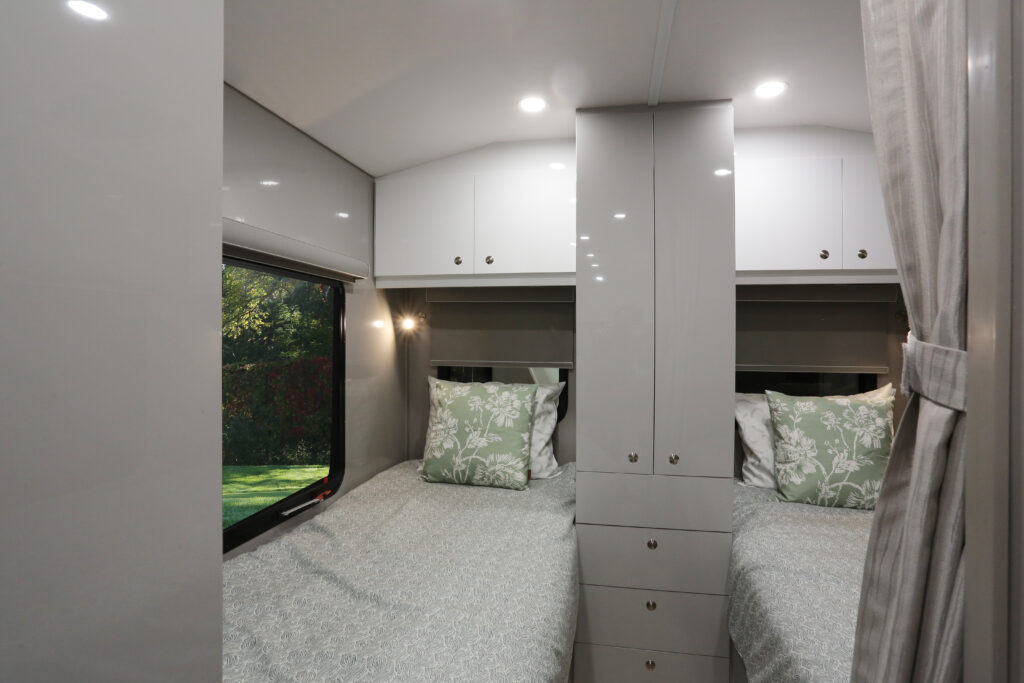 The Agate interior offers a fresh and uplifting feel, with a focus on brightness and simplicity. Crisp white cabinetry, warm European oak flooring, and soft grey accents come together to create a space that feels open, relaxed, and contemporary. Dark charcoal seating adds a touch of contrast, while subtle patterns in the bedding and textures throughout give the interior a stylish yet comfortable finish. Agate is perfect for those who love a clean, modern look with a welcoming, airy atmosphere.